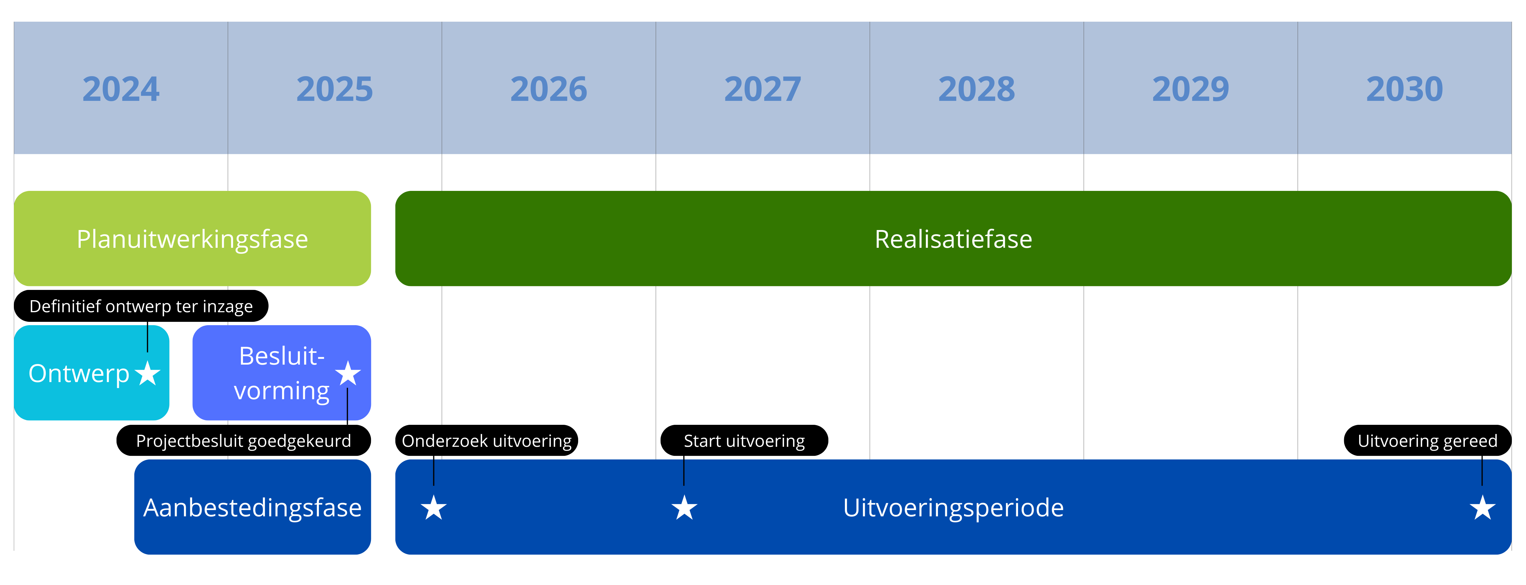 De Realisatiefase start met de aanbesteding voor het aantrekken van een aannemer. De aannemer zal vervolgens het ontwerp nader detailleren en de laatste vergunningen aanvragen. De daadwerkelijke uitvoering zal naar verwachting starten in 2027 en in 2030 worden afgerond.